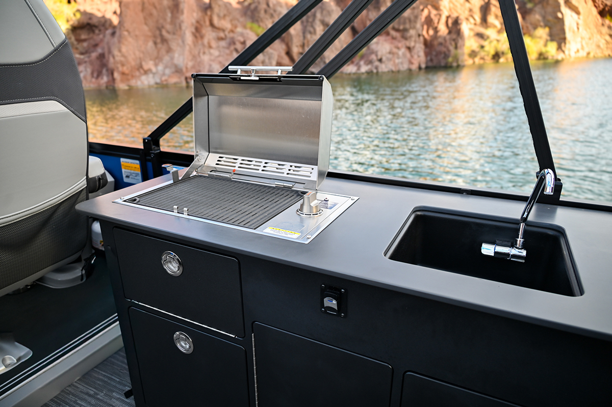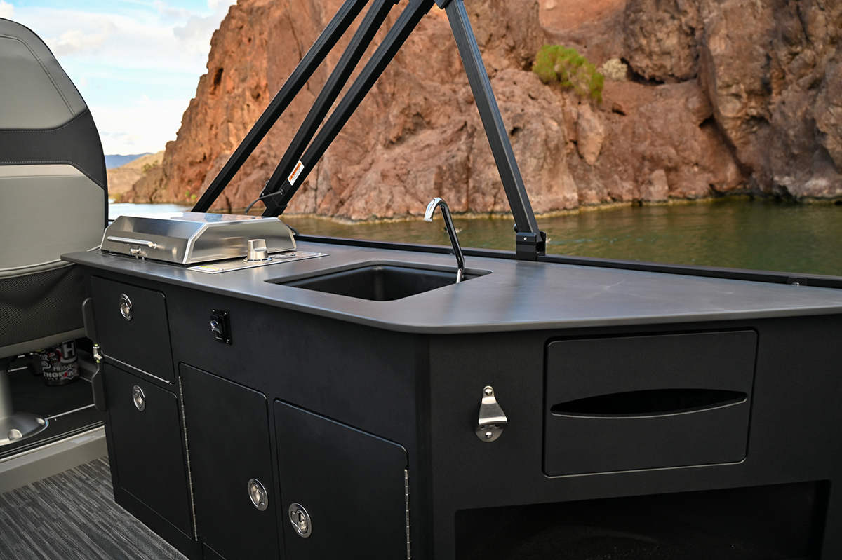 Our new Lago ZB (bar model) couples U-shaped seating in the front with a “party in the back.” Featuring a lounging area with a C-shaped seating arrangement, two flip-flop tables (that can face forward or backward), a large foldable table, an all-electric grill, and a grill, this one’s sure to keep the party going day and night!